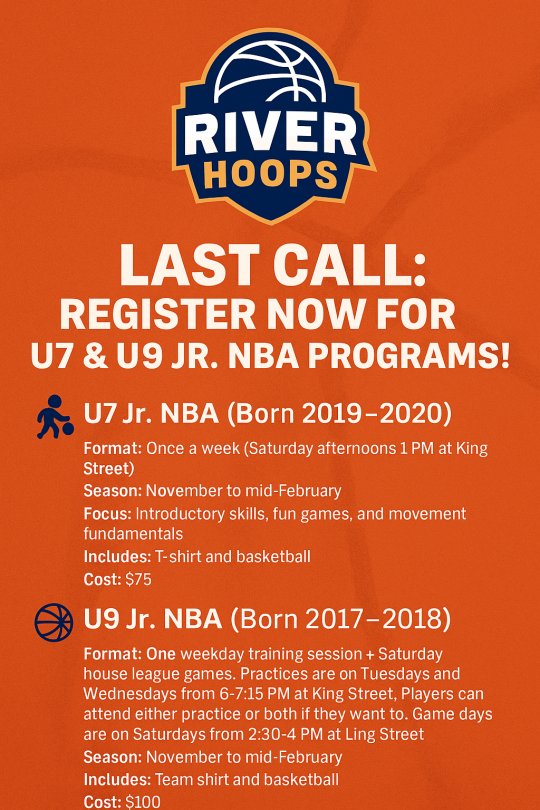 River Hoops is excited to announce that registration is still open—but not for long! Spots are filling quickly for our U7 and U9 Jr. NBA programs, which begins November 1st at King Street Elementary.